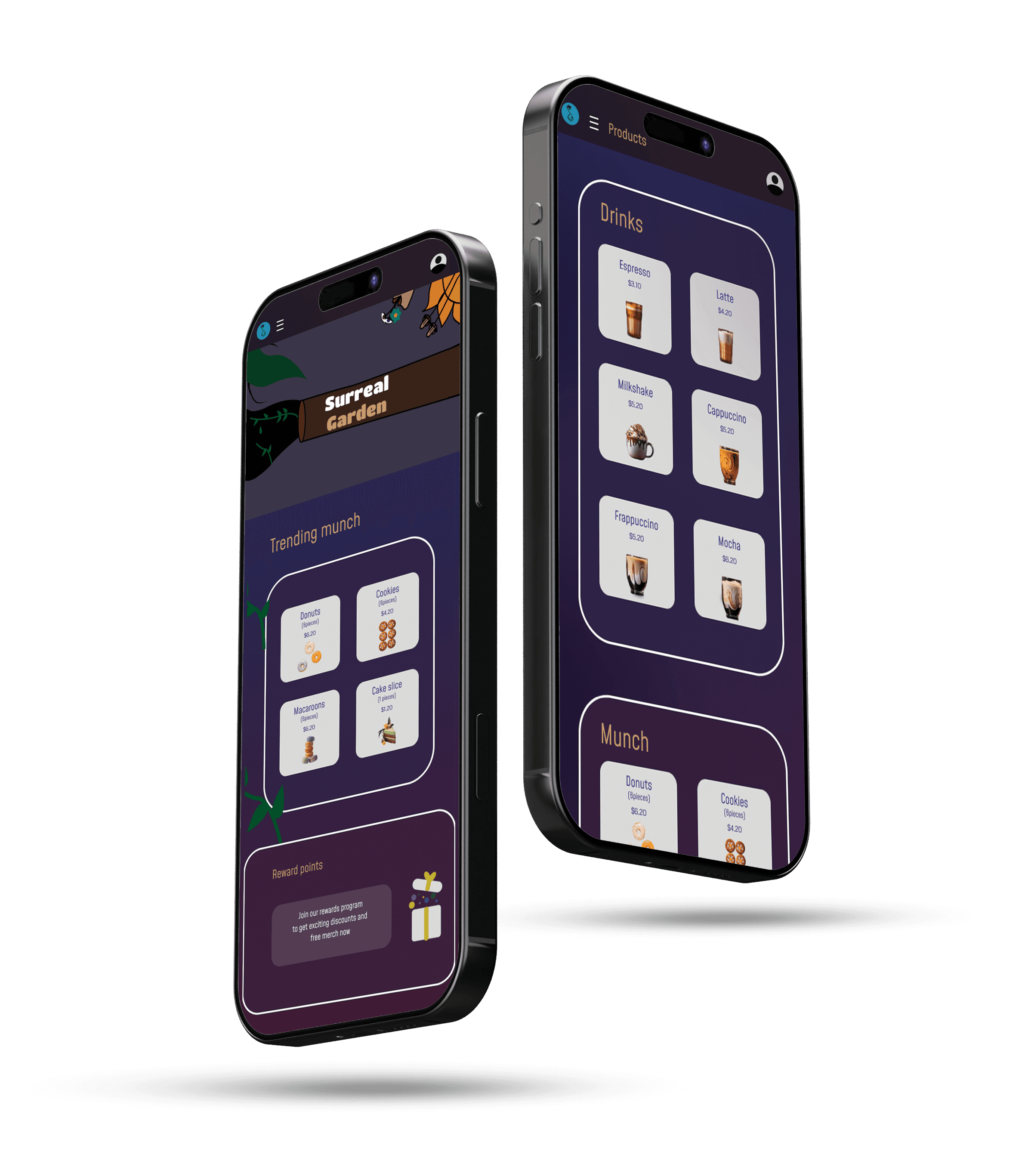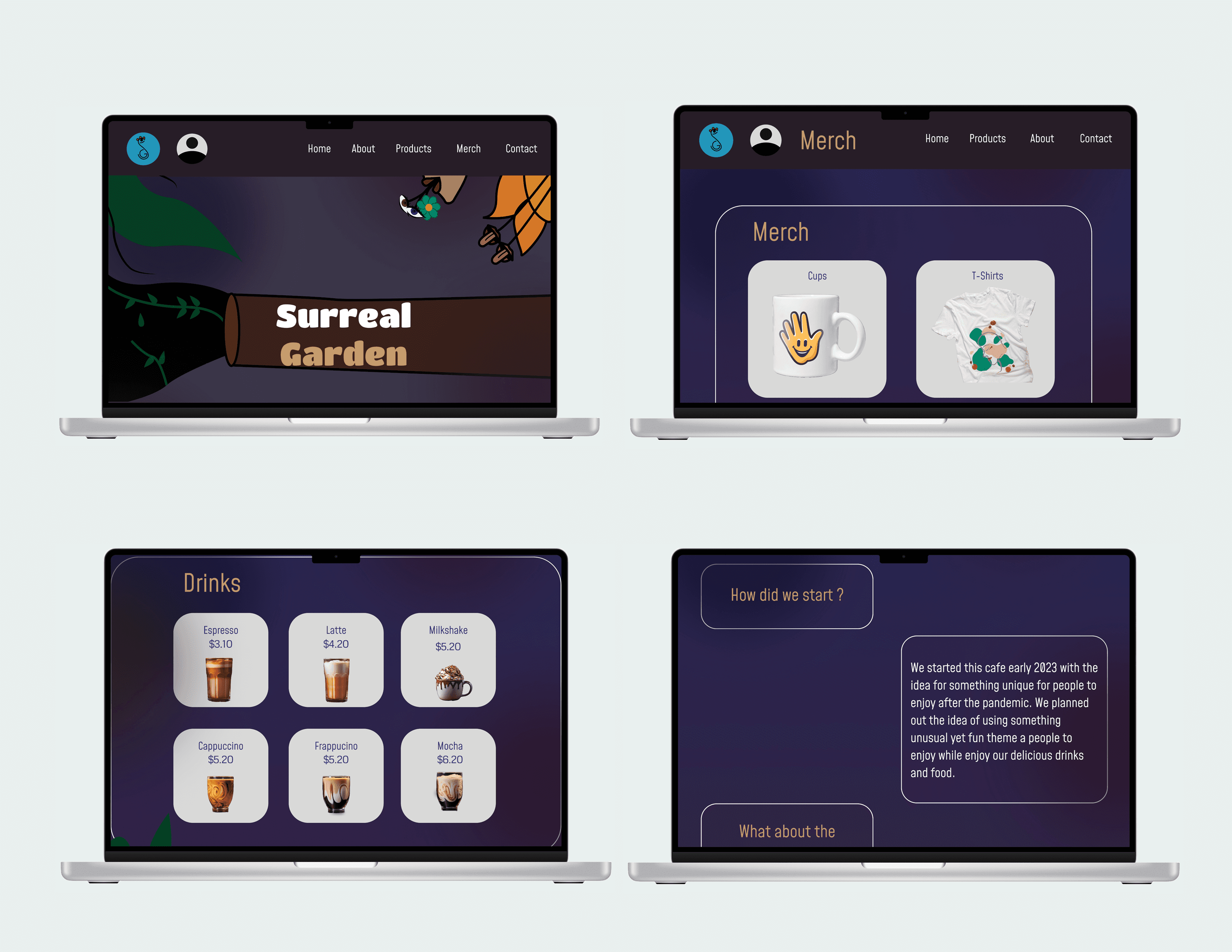 A unique surreal-themed cafe, this app concept designed for a Web design project. Surreal Garden experience is brought to life through mobile, tablet, and laptop screens. Inspired by the rarity and dreamlike charm of surrealism, this app concept was designed for a Web design class project. Surreal Garden is a unique cafe experience brought to life through mobile, tablet, and laptop screens. This was designed for my Web design class.